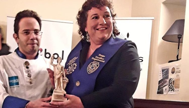 Στην φωτό η Μάγδα Κοντογιάννη παραλαμβάνει το κομμάτι της πίτας από τον κ. Κωβαίο, της Λέσχης Αρχιμαγείρων Αττικής.