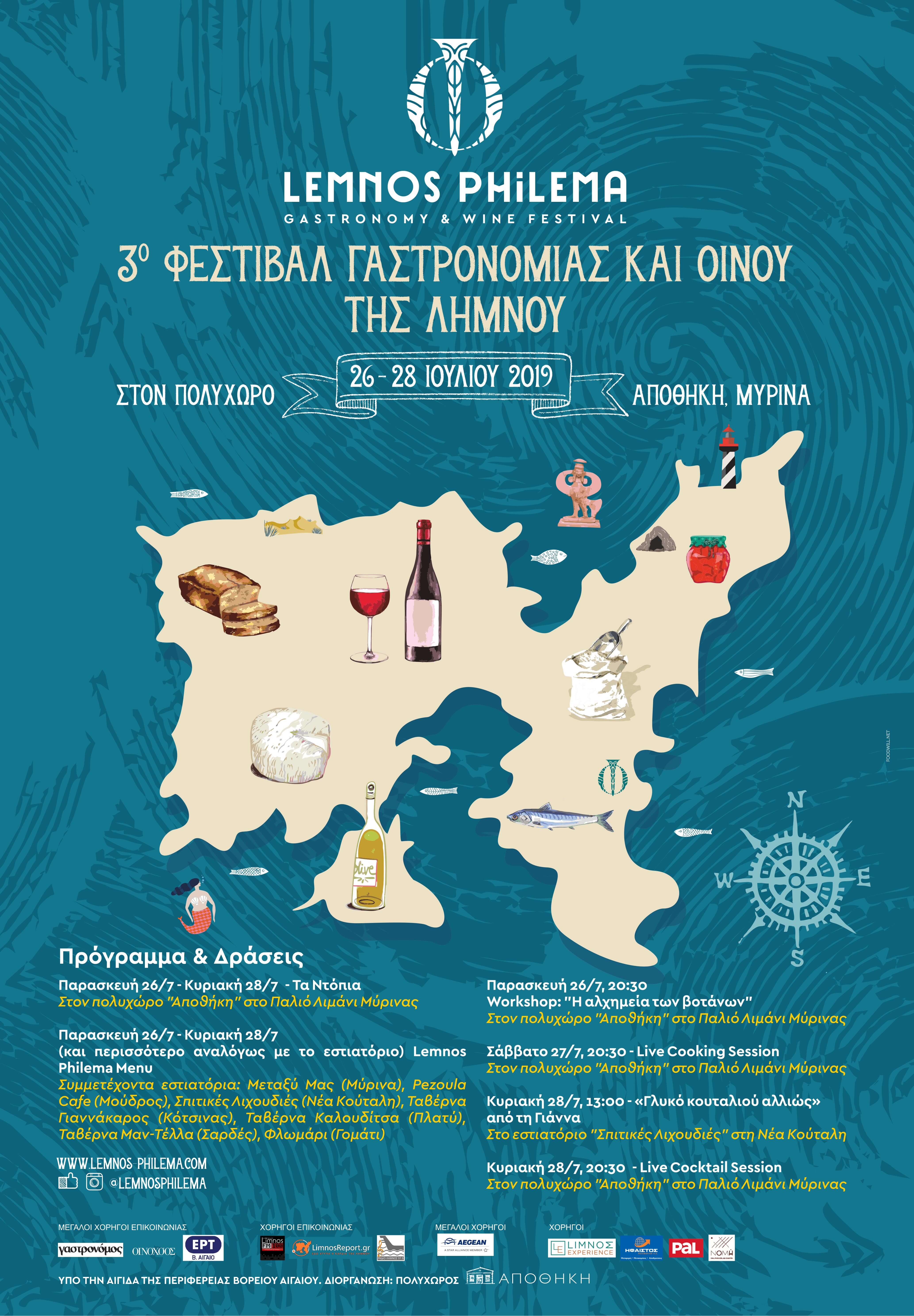 Μια γιορτή γαστρονομίας και κρασιού διοργανώνεται στα πλαίσια του 3ου Lemnos Philema, του Φεστιβάλ Γαστρονομίας & Οίνου της Λήμνου. Στις 26 – 28 Ιουλίου, το Lemnos Philema θα μυήσει τους επισκέπτες στις γεύσεις του νησιού με έναν διαδραστικό και αυθεντικό τρόπο, αυτόν της φιλοξενίας και του φιλέματος.