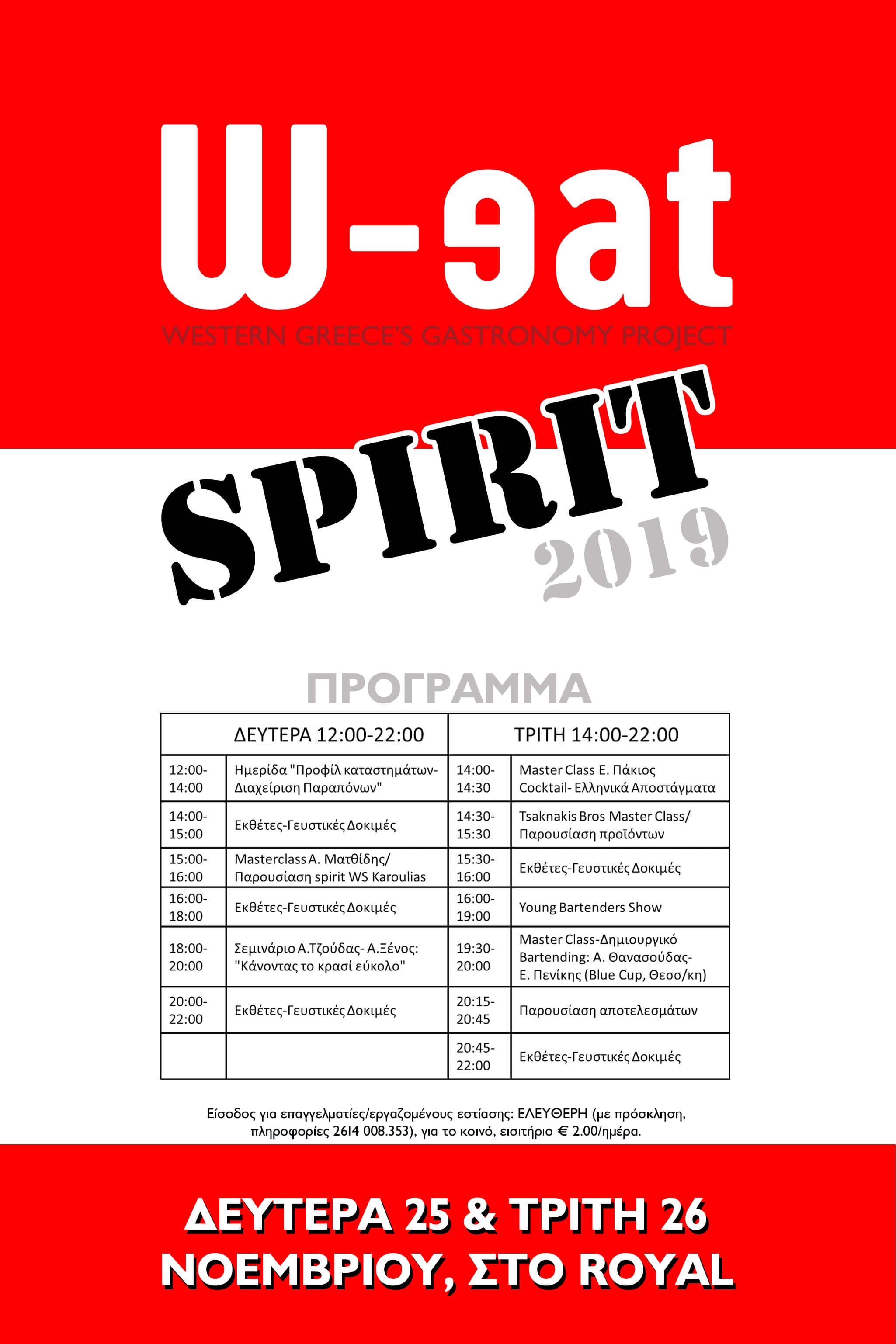 Τοπικοί παραγωγοί που συμμετέχουν με προϊόντα στο διήμερο W-EAT SPIRIT είναι εταιρείες: ΚΑΝΑΚΑΡΗΣ, ΠΑΡΠΑΡΟΥΣΗΣ, ΚΟΥΚΟΣ, ΧΑΧΑΛΗΣ, CAVINO, AMMOUSA, TOULS, KUKAΟ, ORA,VANTANA, ΟΙΝΟΦΟΡΟΣ-ΡΟΥΒΑΛΗΣ, ΚΟΥΤΟΥΛΑΣ,ΚΙΝΤΩΝΗΣ, ΜΡΙΝΤΖΙΚΗΣ, ACHAIA CLAUSS. Χορηγός W-ɘat: ΕΠΙΜΕΛΗΤΗΡΙΟ ΑΧΑΙΑΣ