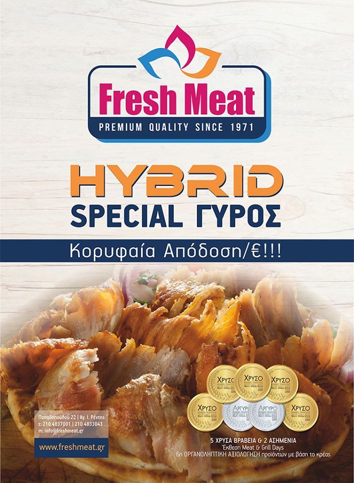 Σε αυτές τις μέρες τις δύσκολες στη Fresh Meat είδαμε τους κόπους ετών να δικαιώνονται, καθώς όλο και περισσότεροι σοβαροί επαγγελματίες της εστίασης στράφηκαν στο προϊόν μας και το προτίμησαν μέσα από έναν υψηλό ανταγωνισμό. Ο ‘Υβριδικός’ μας γύρος αποτελεί την κορωνίδα μιας σειράς προϊόντων της νέας γενιάς της Fresh Meat, απαράμιλλα  σε ποιότητα και γεύση” αναφέρεται στο σχετικό δελτίο Τύπου.
