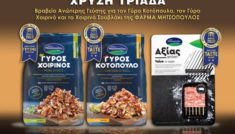 Απόλυτη επιτυχία δύο στα δύο είχε η φετινή συμμετοχή της «Φάρμα Μητσόπουλος» στη διοργάνωση γευσιγνωσίας του International Taste Institute, που έρχεται να συμπληρώσει και την περσινή διπλή της επιτυχία. Συγκεκριμένα δύο νέα προϊόντα της σύγχρονης αμιγώς ελληνικής εταιρείας με έδρα την Κόρινθο που συμμετείχαν στην αξιολόγηση, o Γύρος Κοτόπουλο Ψημένος σε πρακτική συσκευασία σακούλας 330 γρ. και το Χοιρινό Σουβλάκι σε δισκάκι 960 γρ., κατέκτησαν το βραβείο Ανώτερης Γεύσης (Superior Taste Award).