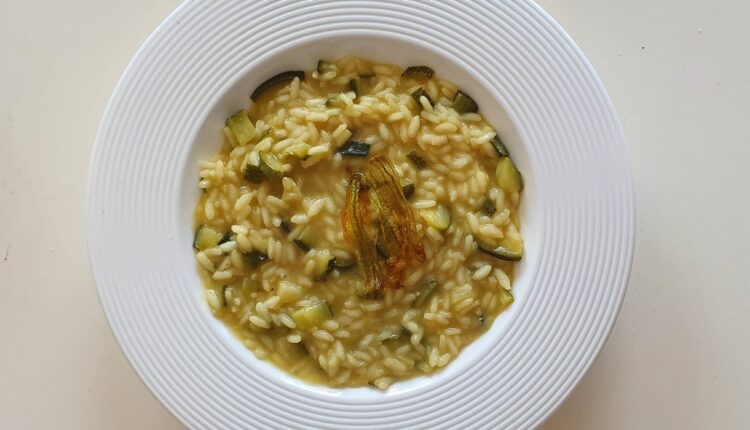 - Άνθη κολοκυθιού: δύο ψιλοκομμένα στο ριζότο μετά το μαγείρεμα, τα άλλα δύο τηγανητά.