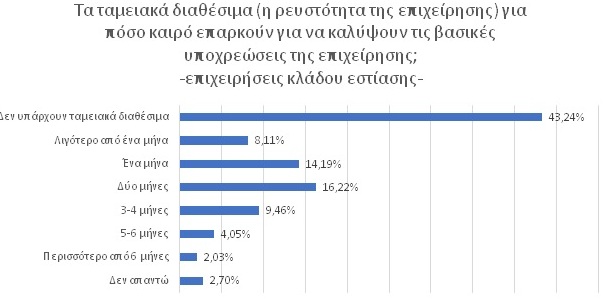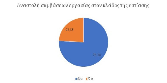 Το 75,38% των επιχειρήσεων του κλάδου της εστίασης έχουν αναστείλει συμβάσεις εργασίας. Εκτιμάται ότι περίπου 200.000 εργαζόμενοι του κλάδου βρίσκονται σε αναστολή εργασίας. Αυτές οι θέσεις εργασίας βρίσκονται σε επισφάλεια, καθώς περισσότερες από 4 στις 10 επιχειρήσεις εστίασης φαίνεται πως αντιμετωπίζουν σοβαρά προβλήματα ρευστότητας. Υπάρχει κίνδυνος απότομης αύξησης της ανεργίας εάν οι επιχειρήσεις που τελούν σε αναστολή ή υπολειτουργούν και έχουν αναστείλει συμβάσεις εργασίας προχωρήσουν σε εκτεταμένες απολύσεις εάν αρθούν ή/και δεν επεκταθούν τα μέτρα προστασίας. Αυτό θα είναι αποτέλεσμα είτε διακοπής της επιχειρηματικής δραστηριότητας, είτε υπό το βάρος των συσσωρευμένων υποχρεώσεων και της μειωμένης ζήτησης δεδομένου ότι η επαναφορά στην οικονομική και κοινωνική κανονικότητα δεν θα γίνει αυτόματα αλλά σταδιακά.